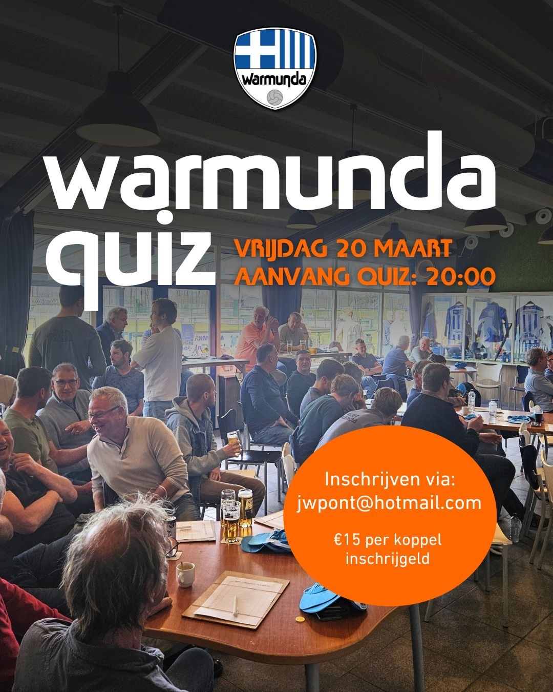 ⚽ Warmunda Voetbalquiz – Vrijdag 20 maart Op vrijdag 20 maart organiseert Warmunda een gezellige en uitdagende Voetbalquiz. Een avond vol sportieve kennis, verrassende vragen en een gezonde dosis competitie. De quiz vangt aan om **20 uur**. Deelname bedraagt **€15 per koppel**. Iedereen is van harte welkom – of je nu een fanatieke voetbalkenner bent of gewoon zin hebt in een leuke avond uit. Hoewel voetbal centraal staat, blijft het daar niet bij. Naast vragen over binnen- en buitenlands voetbal kun je ook rondes verwachten met lokale voetbalkennis en verrassende thema’s. Kortom: een gevarieerde quiz waarin ieder duo kans maakt op de winst. Vorm een team met je quizpartner, test jullie kennis en ga de strijd aan met andere koppels. Wie mag zich aan het einde van de avond quizkampioen noemen? **Inschrijven kan via:** 📧 [jwpont@hotmail.com] We hopen jullie op 20 maart te mogen verwelkomen voor een sportieve en gezellige avond.
