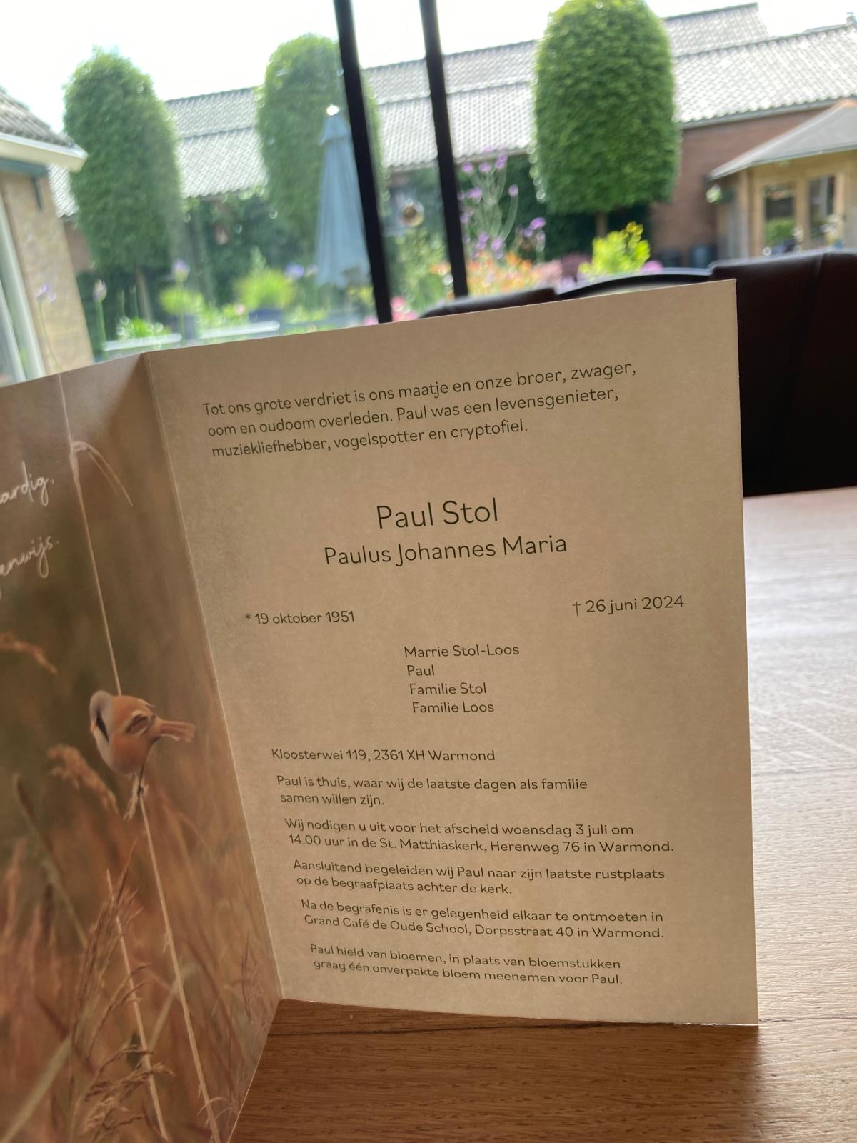 Van Paul kan afscheid worden genomen aanstaande woensdag 3 juli vanaf 14.00 uur in onze Sint Matthiaskerk (zie verder de rouwkaart).